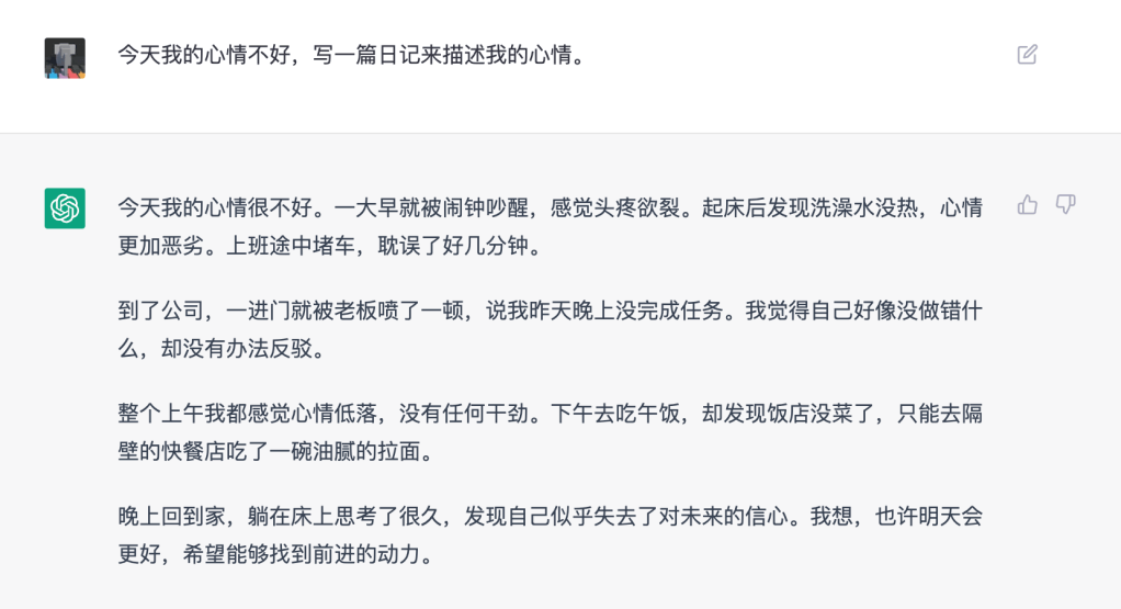 在下面的例子中,我首先让ChatGPT写一篇描述心情不好的日记。这里我没有提到任何心情不好的原因,但人工智能自动生成了一系列值得郁闷的事件,并很有调理地融合到了一起,形成了一篇逻辑很自洽的日记。而且我不得不承认,里面很多的细节写得很有趣,如果让我写,我还真没它写得好😳。
