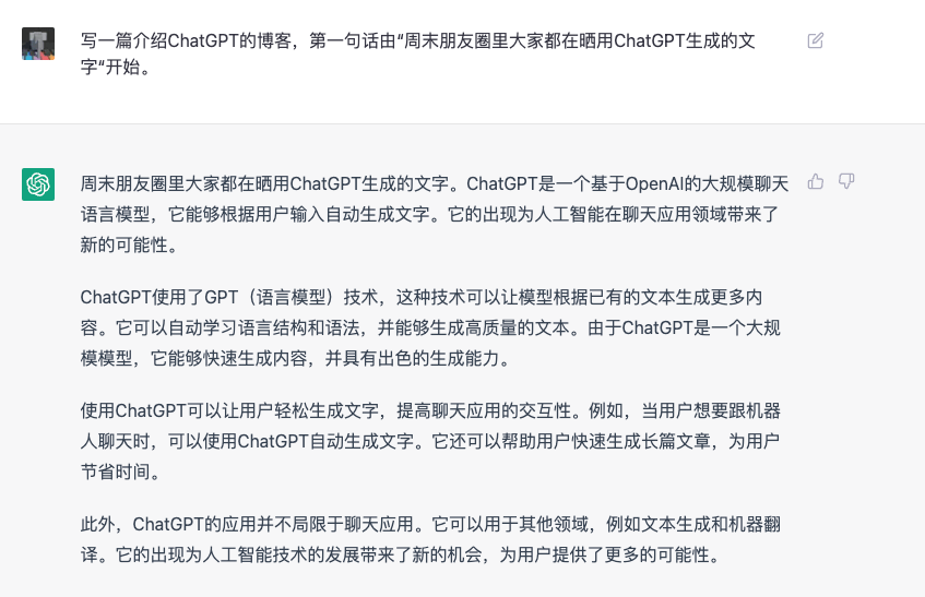 周末朋友圈里大家都在晒用ChatGPT生成的文字。我今天玩了一早上,真心被震撼到了。ChatGPT是OpenAI上周刚刚开放的人工智能聊天应用。它不是一个简单的聊天机器人用来回答你一些在Google上可以搜索到的问题。ChatGPT使用了最新的人工智能模型来“理解”用户提出的问题,并生成高质量且具有创意的内容。这是我第一次使用ChatGPT后的一些感想。