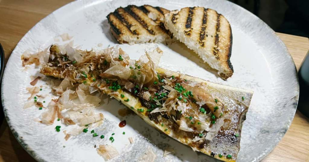 1. 炭火烤牛骨髓配干鲣鱼片:单吃牛骨髓很容易被腻到,配鲣鱼片又提鲜又去腻,非常好的搭配。