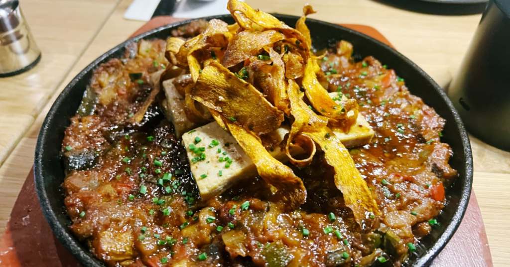 2. 日式照烧茄子配煎豆腐和干红薯片:下面是用铁板做的照烧茄子。感觉酱汁是自己配的,不是偏甜照烧汁,有点中餐酱烧茄子的感觉,小丸子很喜欢。