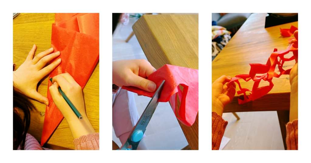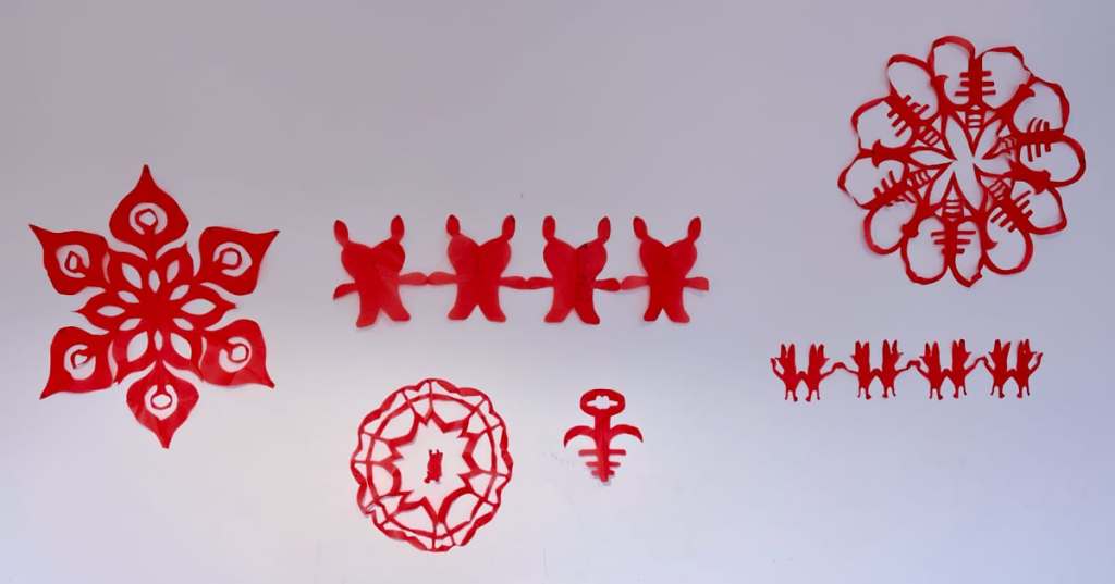 今天我们给小布丁安排了两项活动。首先是我带着她剪窗花。这是小布丁第一次学剪窗花,一开始她不理解折叠的用意,每次都把该连接的地方剪断。后来我让她从比较简单的“横版”窗花开始剪起,下面照片里手拉手的小兔子就是她剪的。