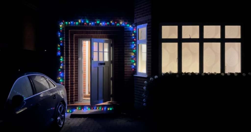 去年是我第一次挂彩灯。原因是我当时买了一串新的圣诞树挂灯,于是就把旧的挂灯放在屋外了,沿着门框绕了一圈。之前我一直觉得把彩灯接到外面会很麻烦,因为可能需要户外电源。但那次我发现其实可以将电线从窗缝接到外面,还是很方便的。我记得完工后我超级兴奋,晚上一直在家门口的路上来回溜达。