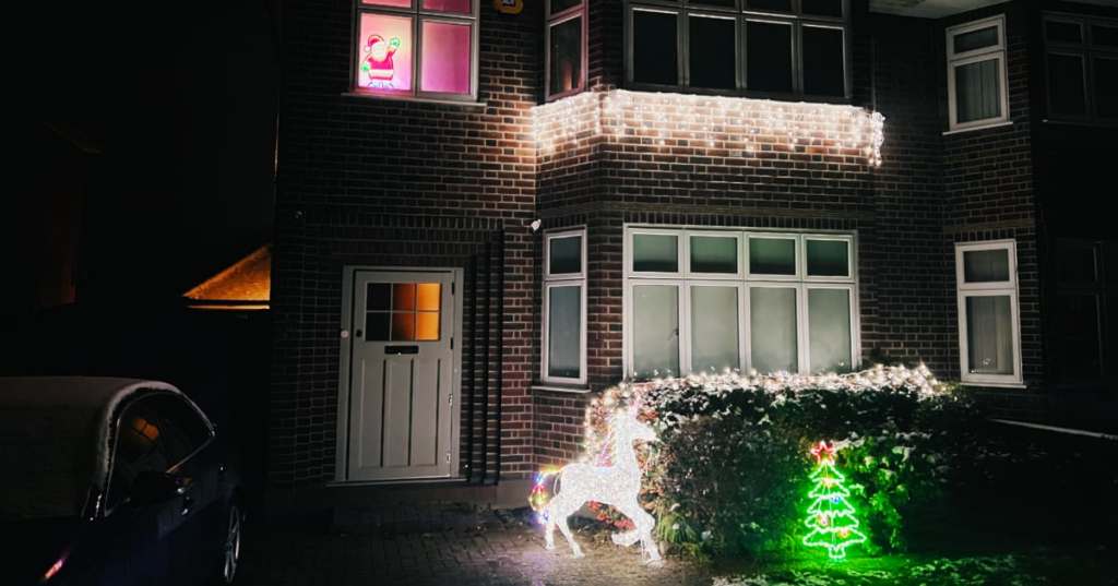 基于去年的经验,今年我们打算挑战一下新的难度。我们准备了两排下垂的冰柱装饰灯,外加上了一个圣诞老人灯,一个圣诞树灯,和一个小布丁强烈要求的独角兽灯。我看邻居都是把冰柱装饰灯挂在房檐下的,但我有点害怕爬梯子到房顶得高度,所以就把灯顺着窗户出来挂在窗台上。为了节约电,我们还配了几个定时开关,到深夜时彩灯就自动关了。
