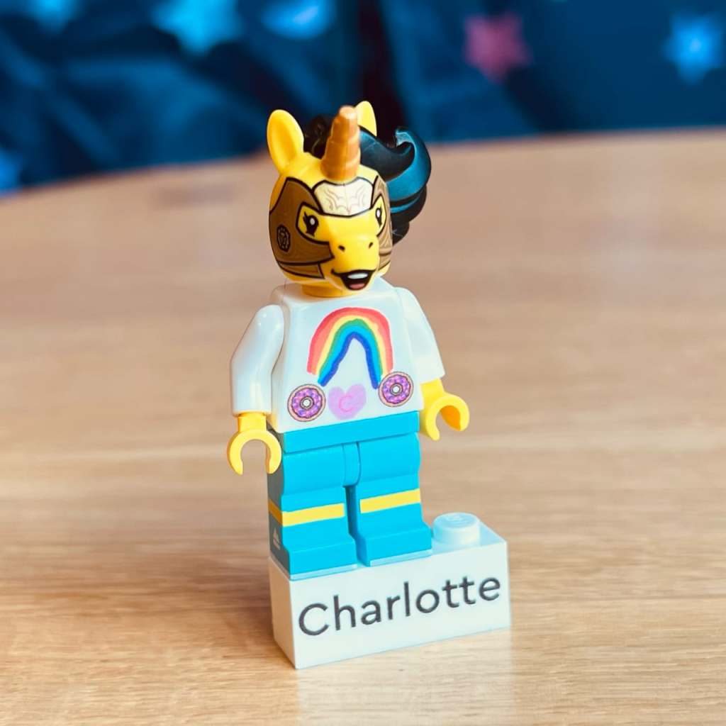 这次小布丁还设计了自己的Lego小人,选取了她平时最喜欢的元素,独角兽,彩虹,面包圈.